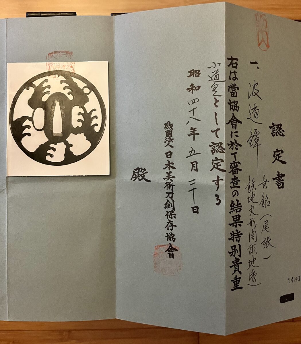 Although unsigned, like many of their works, this tsuba is NBTHK Tokubetsu Kicho papered to Owari School. Kantei for Owari Tsuba is based primarily on the quality of the iron. Other tells are, the presence of tekkotsu*, symmetry and many times, a square rim. Owari Tsuba have a certain look that aficionados quickly learn to identify. Their strong form reminds us of their purpose; as battle implements of the Samurai.