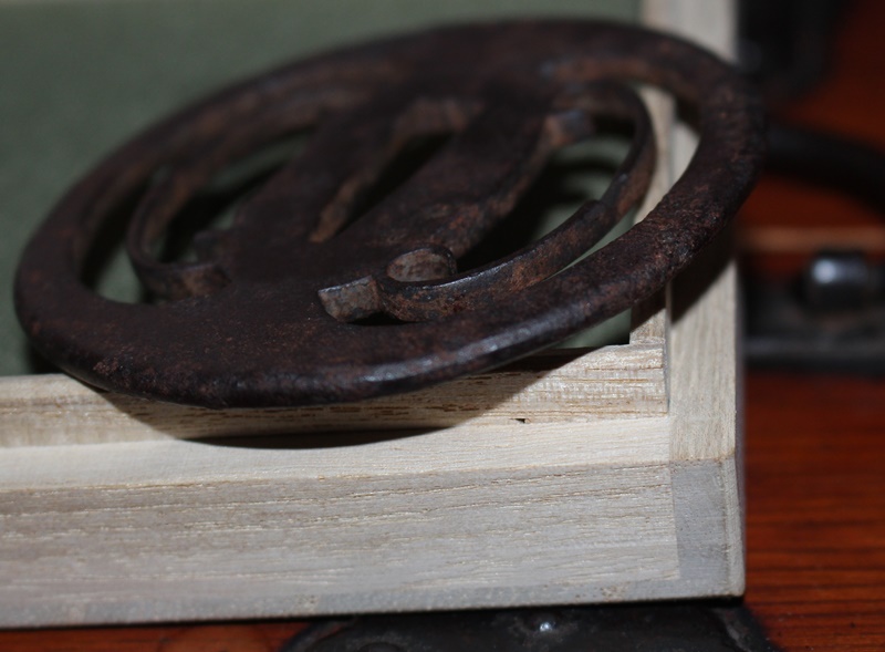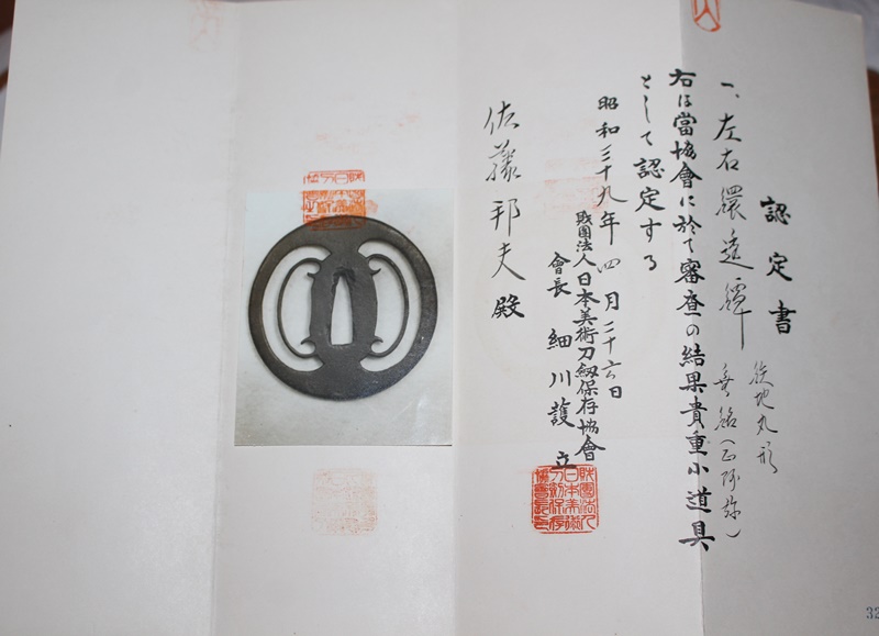 I really like the design on this one. It would be a great tsuba for a wakizashi mount. It is NBTHK Kicho papered from 1964. Great value. Much less than the cost of papers today.